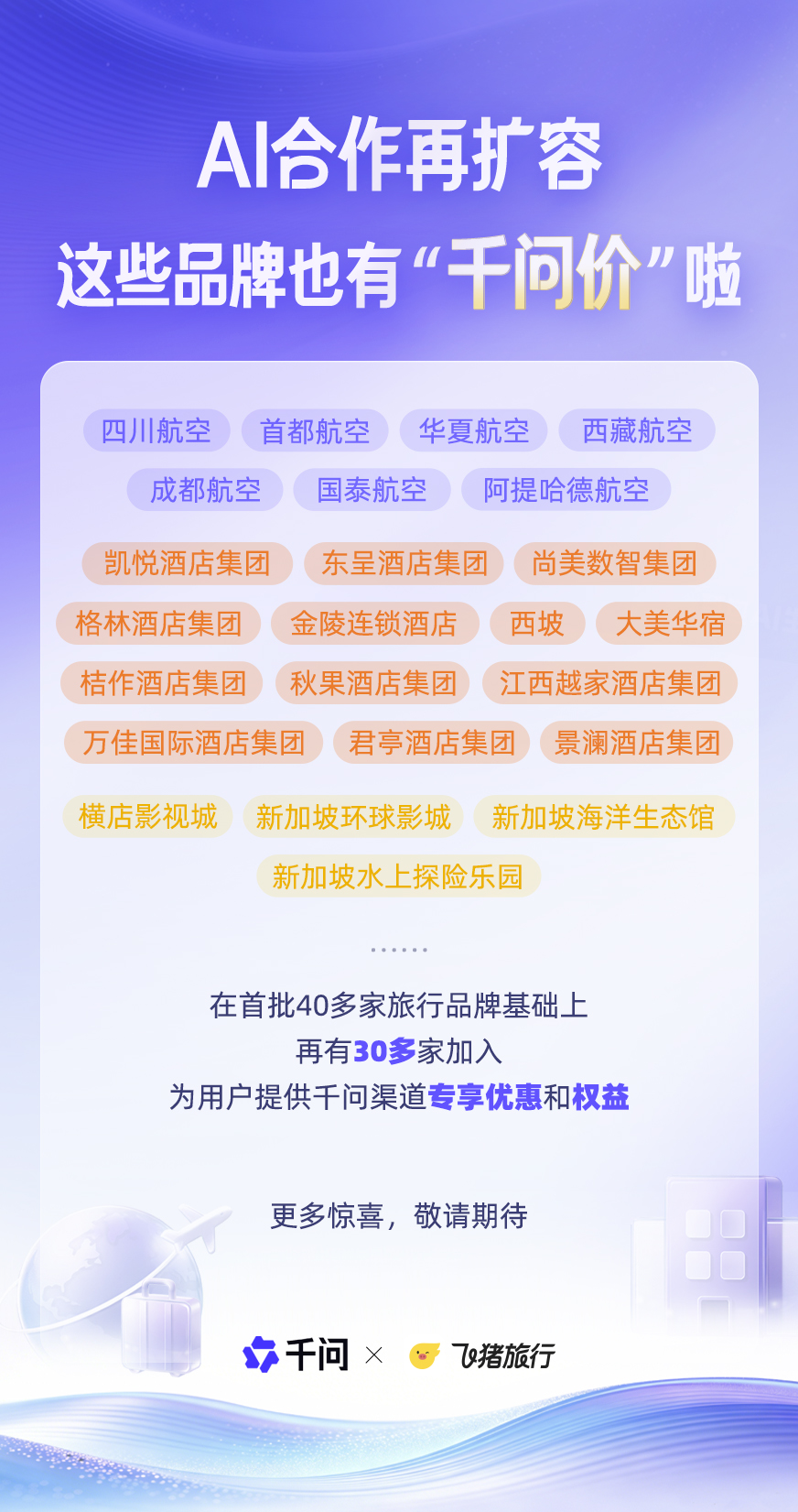 取千问和飞猪告竣AI合做的旅行品牌敏捷扩充。凯悦酒店集团、东呈酒店集团、尚美数智集团、格林酒店集团、金陵连锁酒店、西坡、大美华宿、桔做酒店集团、秋果酒店集团、江西越家酒店集团、万佳国际酒店集团、君亭酒店集团、景澜酒店集团等酒店品牌,它即刻理解用户企图并保举了CX965、CX959、CX961三个分歧时辰起飞的航班,立减金额30元到60元不等,