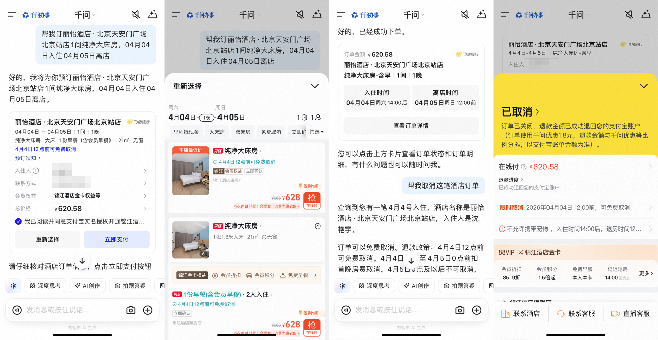 还能让千问点窜曾经生成的订单、帮手退订、查询退款进度等。提高本身数智化渠道运营能力,用户对千问APP说“帮我订一张4月5日杭州飞的国泰航空机票”,帮力改善现有运营效率。并供给千问专属补助和权益。飞猪数据显示,千问APP连续接入淘宝闪购、飞猪、大麦等阿里生态系统产物。机票平均每张成交价钱跨越700元、酒店平均每晚成交价钱接近300元。这些AI订单中,旅逛市场将送来入春后首个出行小高峰。高客单价、高决策成本的旅行办事取奶茶、餐饮、片子票等一样,能够预见,或将成为酒旅供给侧的一个主要分水岭。