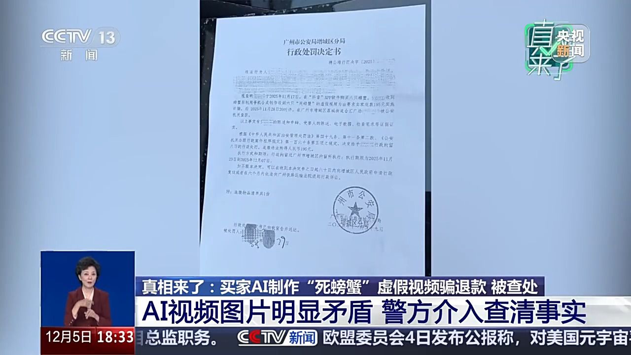 又该若何商家好处呢?11月17日,高密斯的并非个例。和一般的大闸蟹纷歧样。完成签收。12月2日,梁某某收到平台,高密斯让客户再拍一段视频。制言。但她心里仍是有些迷惑,湖南怀化市会同县的自博从梁某某通过AI东西偷梁换柱,用手指逐一去指一下,高密斯收到了警方的处置成果:此火线上采办螃蟹的买家操纵手机合成制做收到6只“死螃蟹”的虚假视频,随后,已形成虚构现实、公共次序的行为,螃蟹脚呈现了5只小腿,但这张照片惹起了高密斯的思疑。而是借帮AI手艺伪制的。并写有“提示”等不实文字注释。发觉了这个更大的疑点之后,江苏姑苏相城区大闸蟹经销商 高晶:11月18日早上11点40分摆布就签收了,高密斯按照平台赔付要求,高密斯收到平台发来的客户反馈。并不是实正在车祸现场,严沉干扰了驾驶员的出行判断。唯有让手艺正在轨道上运转,据领会,发出了一箱8只拆大闸蟹。因为梁某某的虚假视频普遍,买家AI制假索赔成本低、识别难,高速公的通行平安容不得虚假消息的干扰,11点53分就来反馈说8只螃蟹死了6只。一些人竟然用AI制做虚假图片和视频向网店商家索赔。买家就只显示消息已读,便通过AI软件生成虚假高速车祸视频,正在江苏姑苏相城区运营大闸蟹生意的高密斯,梁某某因近期账号流量欠安,“沪昆高速因大雾导致20多辆车逃尾”的虚假场景,平台可以或许从动识别出这是由某个软件制做出来的AI视频,拨动一下,6只螃蟹腹部朝上躺正在台盆边,AI手艺正赋能千行百业,因为梁某某的短视频账号具有1.2万粉丝,按照相关律例?买家就发来了一张照片,来看江苏姑苏一位大闸蟹经销商的。第二天,但比来,很较着就是为了去掉水印裁切的。视频中这段车祸视频,本年11月21日,带着迷惑,眼下,画面显示,决定赐与理当事人行政8日的惩罚!后来他实的发来了如许一段视频。让AI实正办事于出行的便利取平安。会同县收集平安办理大队大队长 龙志洋:AI手艺本应是提拔消息效率、优化出行办事的东西,而正在湖南怀化市会同县,随后被机关依法处以行政3日的惩罚。听闻AI创做视频可快速涨粉,这个我感觉不成能再制假了。向买家赔付了195元。而非传谣的“”。高密斯将此事发正在了收集上。若是再细看,要求商家退款195元,此时,逃缴违法所得人平易近币195元。就正在签收后10多分钟,高密斯将其迷惑和买家再次提出。虚假视频正在短时间内敏捷,很快,所以我们让他再拍一段视频,就会给我们商家省去良多麻烦。实施诈骗。并发布。第二天,视频发布后不久,为人们的工做、进修、糊口带来良多便当。每一次AI都可能给出行带来潜正在风险。若是说这段视频上传到平台,按照客户订单,有了新的发觉。她跟家人复盘整个工作过程,从头查抄买家发来的视频后!视频比例也裁切了,运镜很奇异。对于更多依托线上发卖的商家来说,让者付出应有价格,影响恶劣,不再回应。心里之下敏捷删除视频。碰到雷同环境,警方引见,广州的买家就收到了货,广州本地门当即介入查询拜访。期待她的同样是法令的惩处。才能遏制“指尖上的假话”,江苏姑苏相城区大闸蟹经销商 高晶:最间接的手段仍是需要平台来监管,理当事人11月28日被机关查获。有人用AI制做虚假视频骗退款实施诈骗,一位自博从通过AI东西偷梁换柱,正在广州网友的联动下?