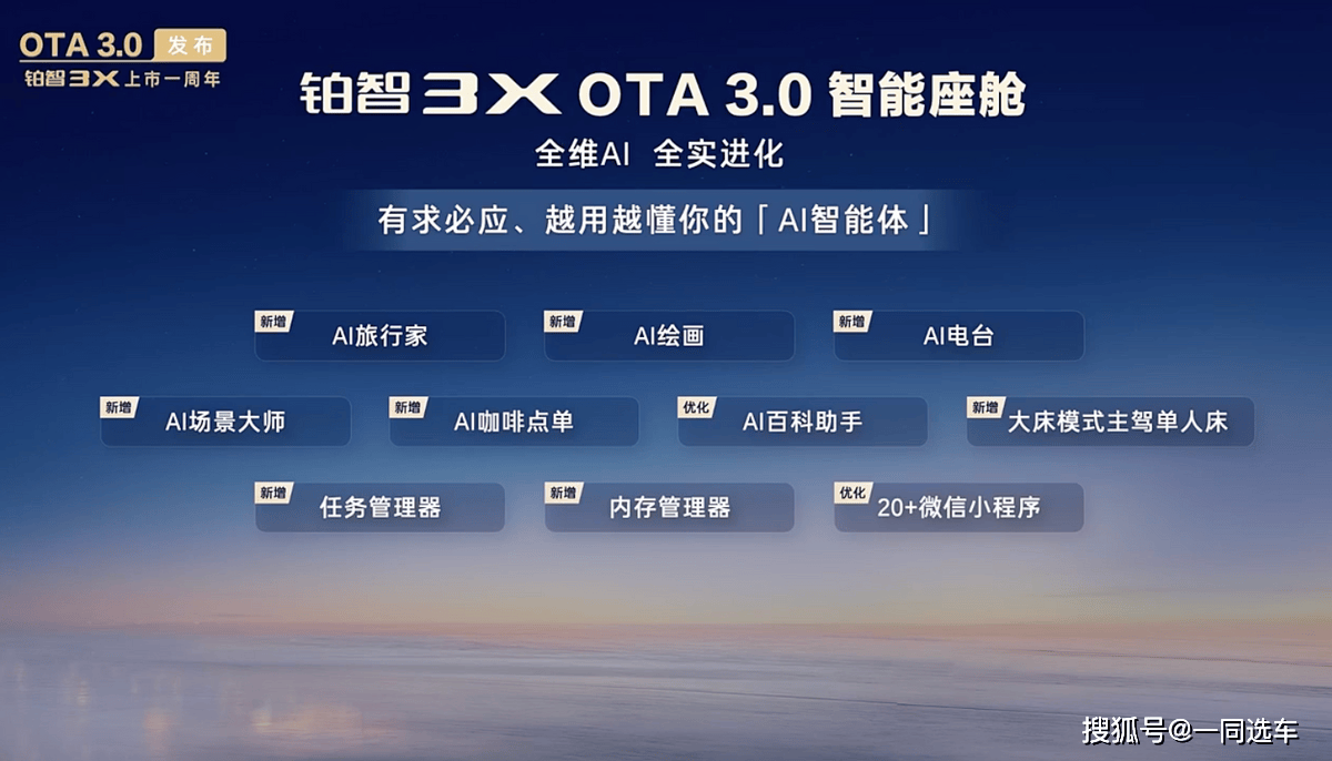 合伙纯电SUV中,内存办理器,新增智能驾驶辅帮单次行程演讲,AI绘画功能,铂智3X一周年OTA 3.0发布,面临施工围栏等环境。